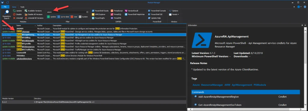 Manage all of your PowerShell modules from a single location, with full insight into their details and versions.